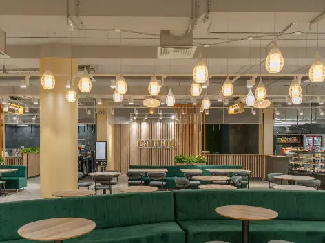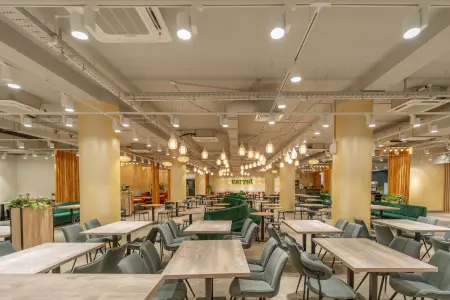 In the university's academic buildings, there are modern canteens with a diverse selection of freshly baked buns and an interesting selection of desserts, coffee, hearty dishes, and salads. Additionally, the canteens have a place for rest and work.